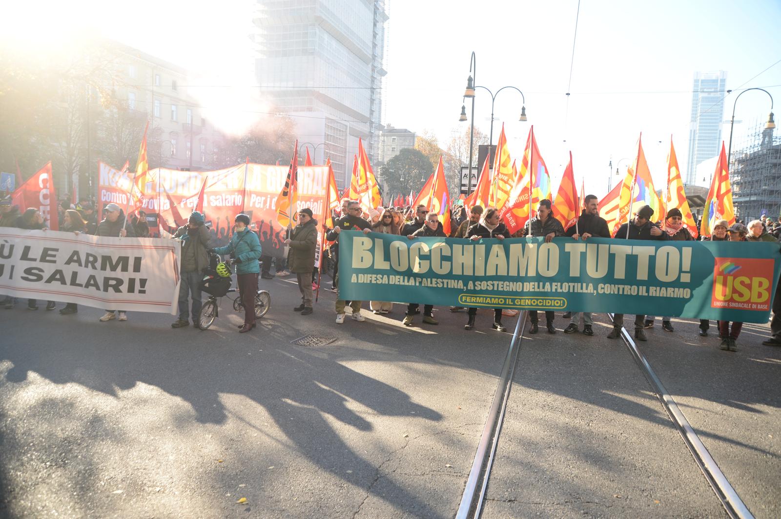 "Giù le armi, su i salari". "Blocchiamo tutto". "Fermiamo i signori della guerra". Con questi slogan è partito oggi, venerdì 28 novembre, il corteo nel giorno dello sciopero generale. Partenza da piazza XVIII Dicembre. La giornata di sciopero è stata proclamata dal sindacato Cub e condivisa da Cobas, Usb e Sgb. In piazza sindacati, studenti, centri sociali.