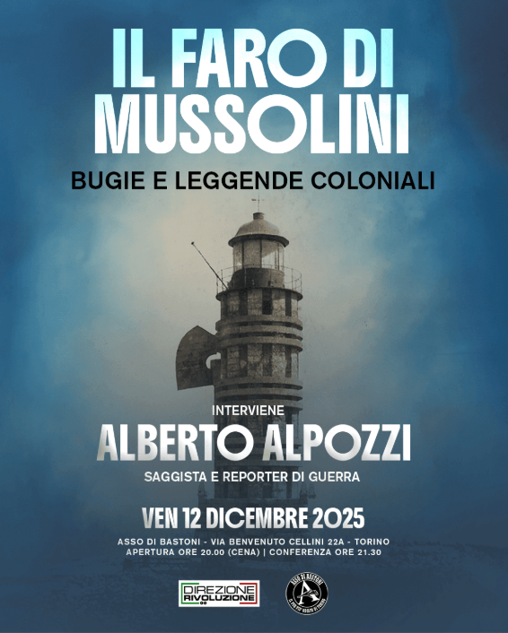 A Torino venerdì 12 dicembre alle 21.30 presso l’Asso di Bastoni di via Cellini 22/a si terrà una conferenza di Alberto Alpozzi, reporter e saggista, che ripercorrerà la storia della colonizzazione italiana. L’evento si propone come un confronto aperto e libero, come sottolineato dallo stesso Alpozzi: «Le idee si fronteggiano con altre idee, non con il divieto di esprimerle».