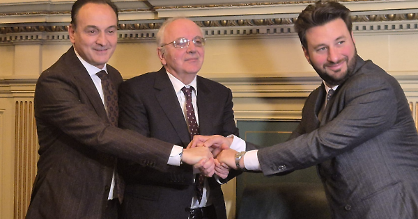 La stretta di mano tra Cirio, Cafagna e Riboldi