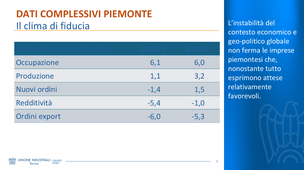 Le aziende piemontesi guardano al primo trimestre 2026 con cauto ottimismo. Produzione e occupazione trainano le aspettative positive, mentre l'incertezza internazionale frena l'export. L'indagine trimestrale del Centro Studi dell'Unione Industriali Torino, condotta su circa 1.200 imprese manifatturiere e dei servizi del sistema confindustriale piemontese, evidenzia un clima di fiducia solido, soprattutto nel capoluogo subalpino.