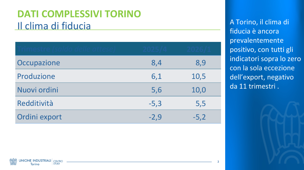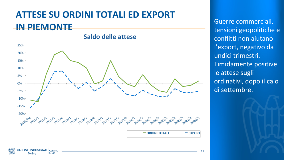 L'ottimismo cala con la quota di export: +8,9% per aziende sotto il 10%, 0,0% per 10-30%, -5,6% per 30-60% e -3,9% oltre il 60%. A Torino, export atteso negativo al -5,2%.