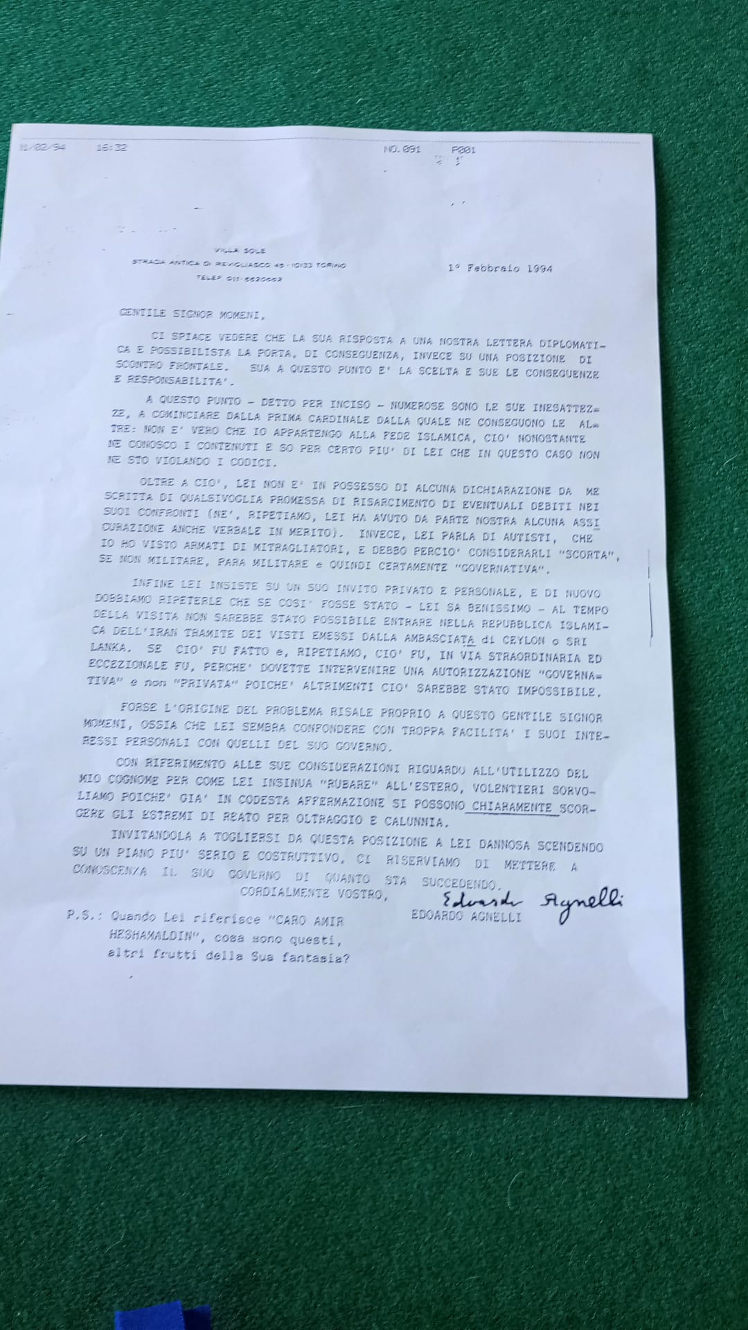 La data è quella del 1° febbraio 1994, il documento è battuto a macchina in stampatello maiuscolo e reca l'intestazione di Villa Bona, dove il figlio dell'Avvocato abitava, sulla collina torinese. Il destinatario è un certo "Signor Homeni", cui Edoardo Agnelli dice senza tanti giri di parole "non è vero che io appartengo alla fede islamica". Precisando "ciò nonostante ne conosco i contenuti e so per certo più di lei che in questo caso non ne sto violando i codici".