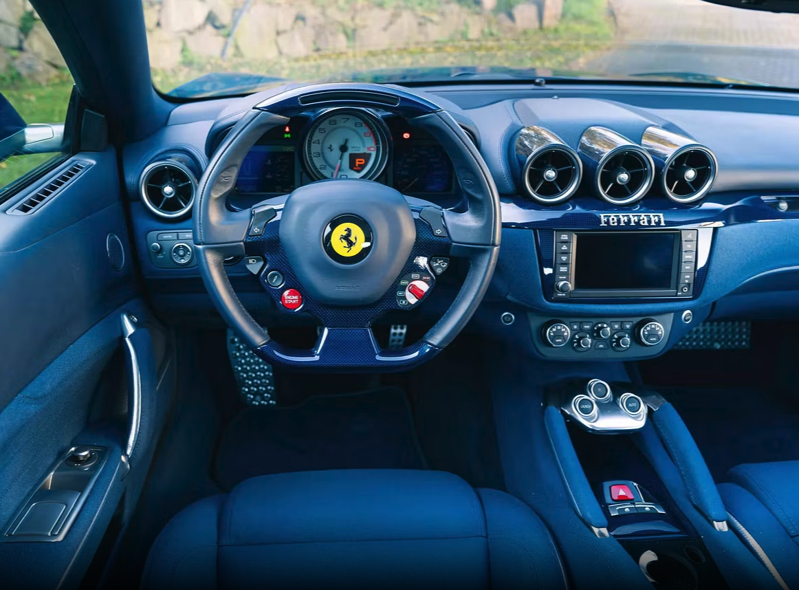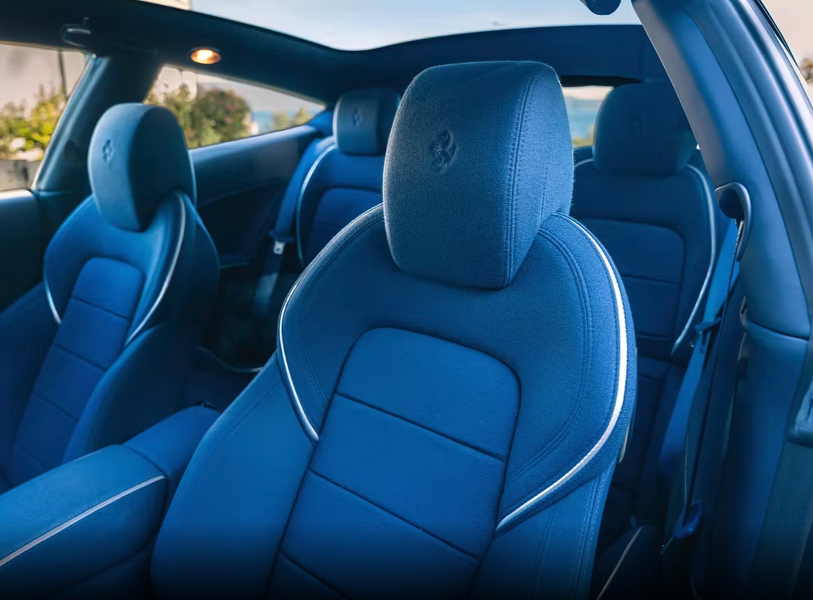La base è la FF, la familiare ad alte prestazioni nata per unire fruibilità e classe assoluta. Lapo Elkann l’ha trasformata in un manifesto personale: carrozzeria nel tono “Novo Blu”, profondo e misurato, e un abitacolo rivestito interamente in stoffa, dal cruscotto ai pannelli porta fino ai sedili e al volante.