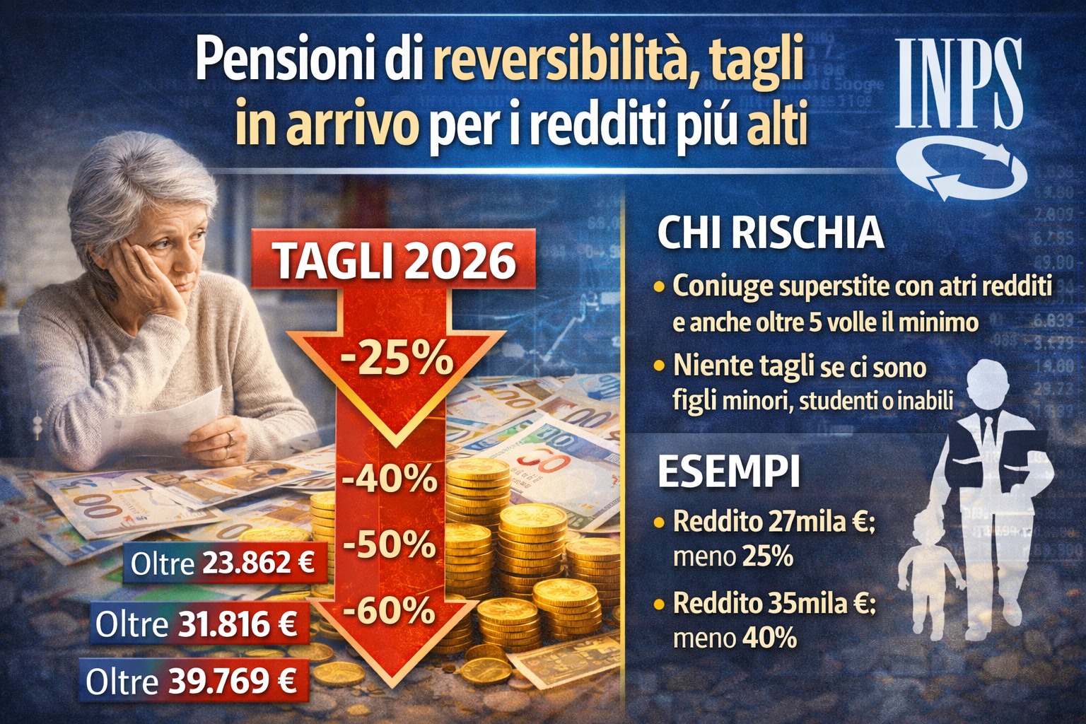Il riferimento è il trattamento minimo rivalutato. Nel 2026 il minimo è pari a 611,85 euro al mese; i tagli scattano solo oltre tre volte il suo valore annuo, cioè oltre 23.862,15 euro di reddito personale. - tra 3 e 4 volte il minimo (fino a 31.816,20 euro): taglio del 25% - tra 4 e 5 volte il minimo (fino a 39.769,25 euro): taglio del 40% - oltre 5 volte il minimo: taglio del 50% Il semplice superamento del trattamento minimo non comporta alcuna riduzione: conta il superamento della prima soglia (tre volte il minimo). I tagli gravano sull’importo di reversibilità spettante al superstite, come ricalcolato dall’INPS.