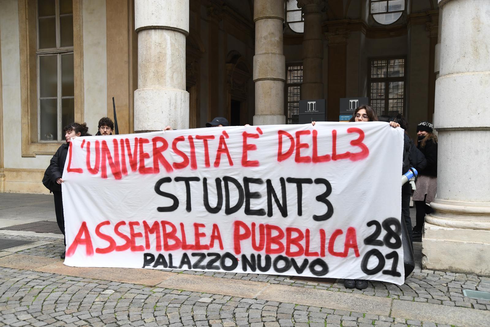 I collettivi, dopo aver esposto lo striscione, sono saliti al primo piano, dove si stava svolgendo la seduta del Senato accademico, tentando di entrare. Seduta che è stata momentaneamente sospesa, per poi riprendere, in un'altra sede. «La seduta del Senato accademico è stata disturbata da urla, cori e uso di megafoni, nonché da ripetuti colpi alle porte e tentativi di accesso ai locali, tali da impedire il regolare svolgimento della seduta - afferma l'Università -. Per garantire la prosecuzione dei lavori, si è reso necessario un cambio di sede, dopo il quale la riunione è proseguita regolarmente. Condanniamo con fermezza ogni forma di aggressione o intimidazione, ribadendo la necessità di tutelare l'Istituzione e il corretto funzionamento delle attività degli organi». Il Senato ha anche approvato a maggioranza una mozione di pieno sostegno alla rettrice Cristina Prandi in relazione al provvedimento d’urgenza che ha interessato Palazzo Nuovo nelle giornate di venerdì 23 e sabato 24 gennaio.