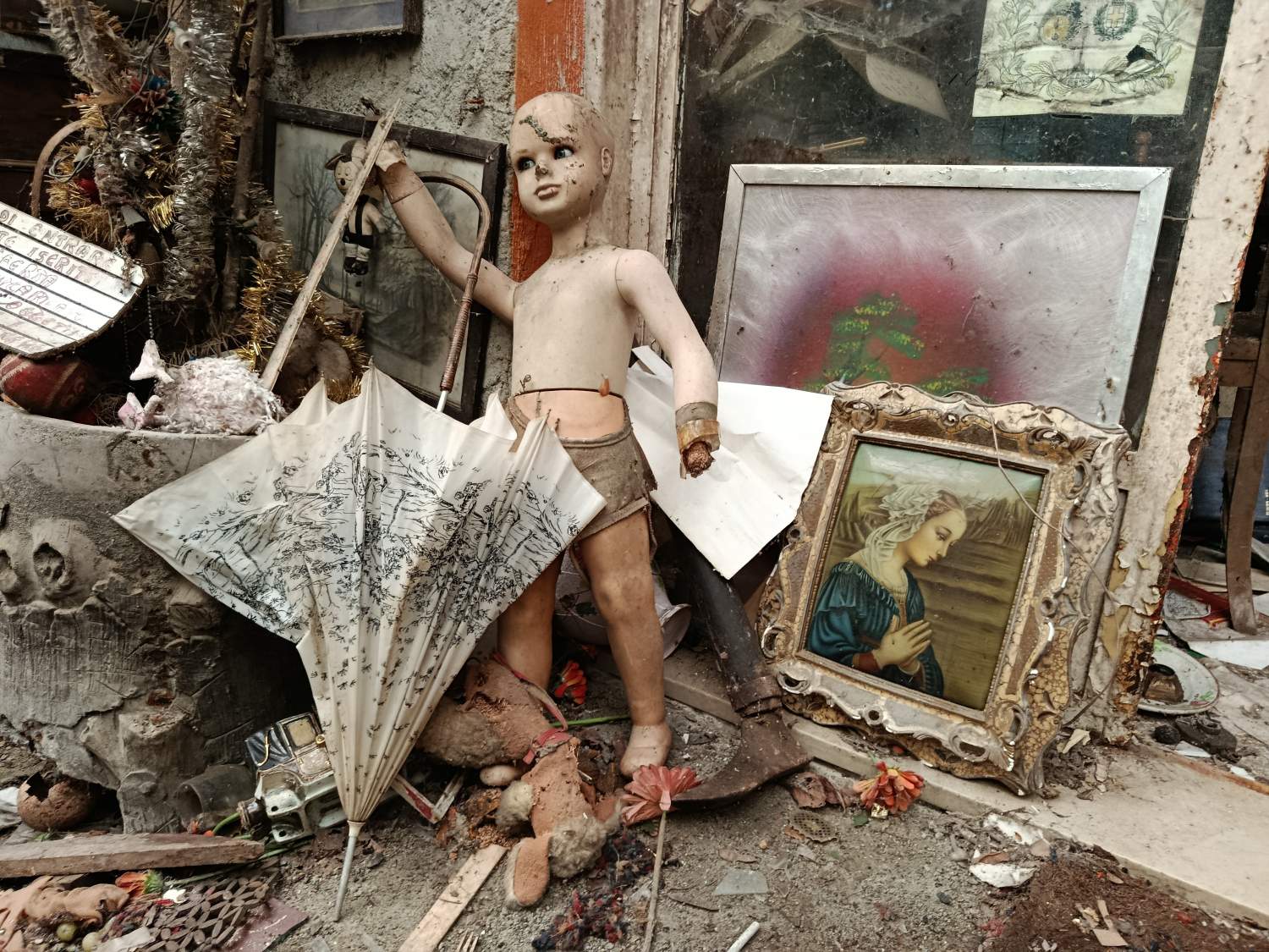 Tra i vialetti invasi dalla vegetazione e le tettoie pericolanti, si trovano ancora oggi ceramiche, fotografie, radio d'epoca, televisori, giocattoli e attrezzi della civiltà contadina, tutti accostati secondo un ordine logico e provocatorio.