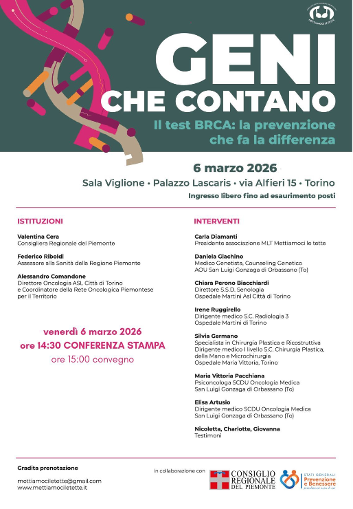 L’acronimo é Brca, ma negli ultimi anni é stato più comunemente chiamata come “la sindrome di Angiolina Jolie” o “di Bianca Balti”. Le due celebrità sono coloro che, grazie alla loro visibilità, hanno acceso i riflettori sulle mutazioni genetiche Brca1 e Brca2, cioè i geni responsabili della riparazione dei danni al DNA e la cui mutazione può aumentare il rischio di sviluppare alcuni tumori, soprattutto al seno e alle ovaie, ma anche alla prostata e al pancreas. Scoprire di essere portatori di questa mutazione cambia radicalmente le scelte di cura. Ma é un tema di cui, nonostante le “vip” l’abbiano portato alla ribalta, c’è ancora poca informazione. Ecco perché domani, venerdì 6 marzo ore 15, a Palazzo Lascaris si terrà l’evento “I geni che contano per la prevenzione”. Un incontro a ingresso gratuito, promossa dall’Associazione Mettiamoci le Tette (Mlt) e in cui, alla presenza dell’assessore alla Sanità, Federico Riboldi, ci si potrà confrontare con gli esperti: Elisa Artusio (oncologa), Silvia Germano (chirurga plastica), Daniela Francesca Giachino (genetista), Maria Vittoria Pacchiana (psiconcologa), Chiara Perono Biacchiardi (ginecologa senologa), Irene Ruggirello (radiologa). Affiancati dalle testimonianze di quattro donne interessate da diversi casi di mutazione BRCA.