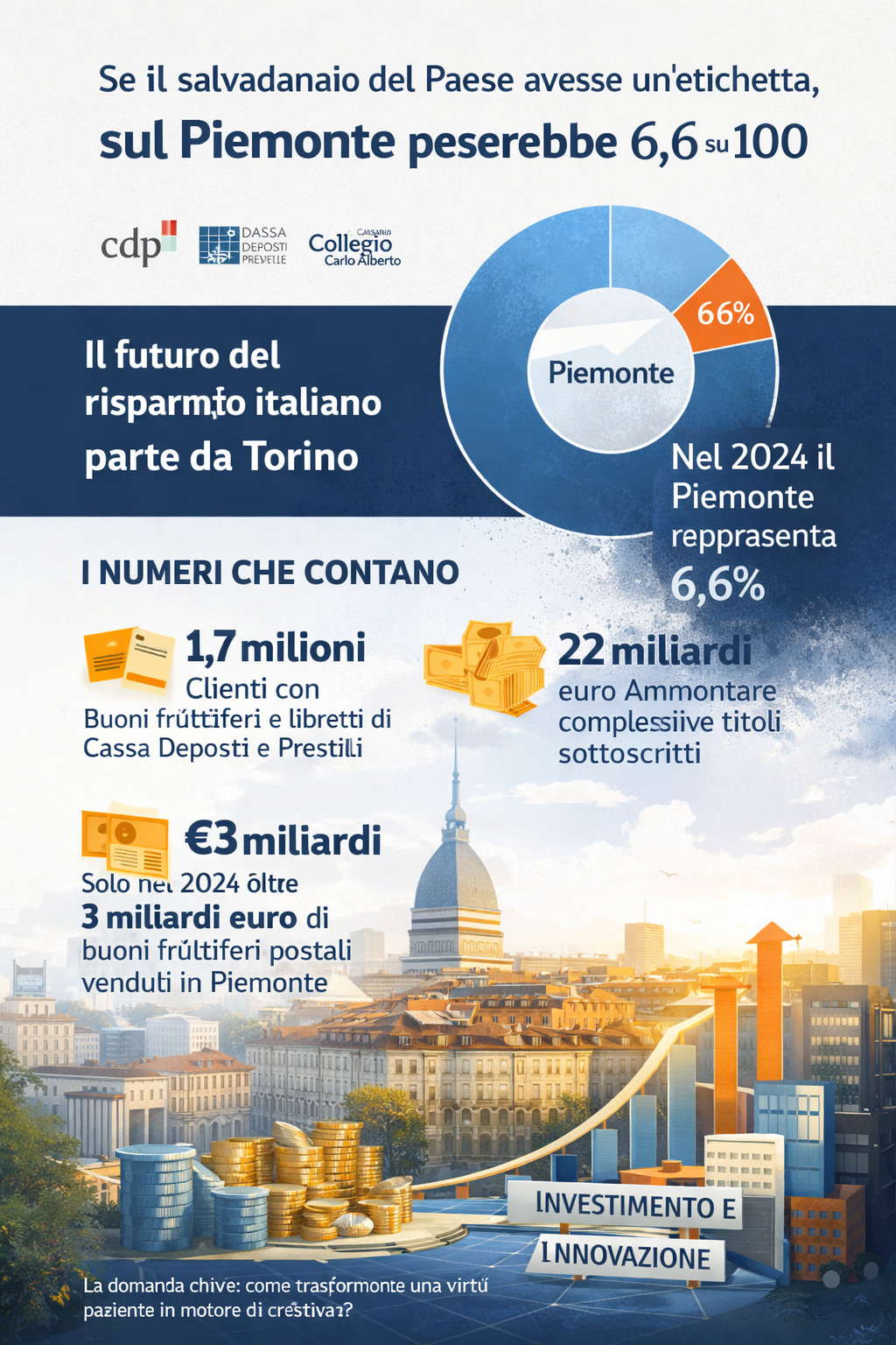 Se il salvadanaio del Paese avesse un’etichetta, sul Piemonte peserebbe 6,6 su 100. È la misura, semplice e potente, di una cultura finanziaria che resta colonna portante dell’economia familiare italiana. A Torino, una giornata di confronto promossa da Cassa Depositi e Prestiti insieme alla Fondazione Collegio Carlo Alberto ha fotografato il presente del risparmio e le sue prospettive in un tempo di trasformazioni economiche e sociali. Domanda chiave: come trasformare una virtù paziente in motore di crescita?