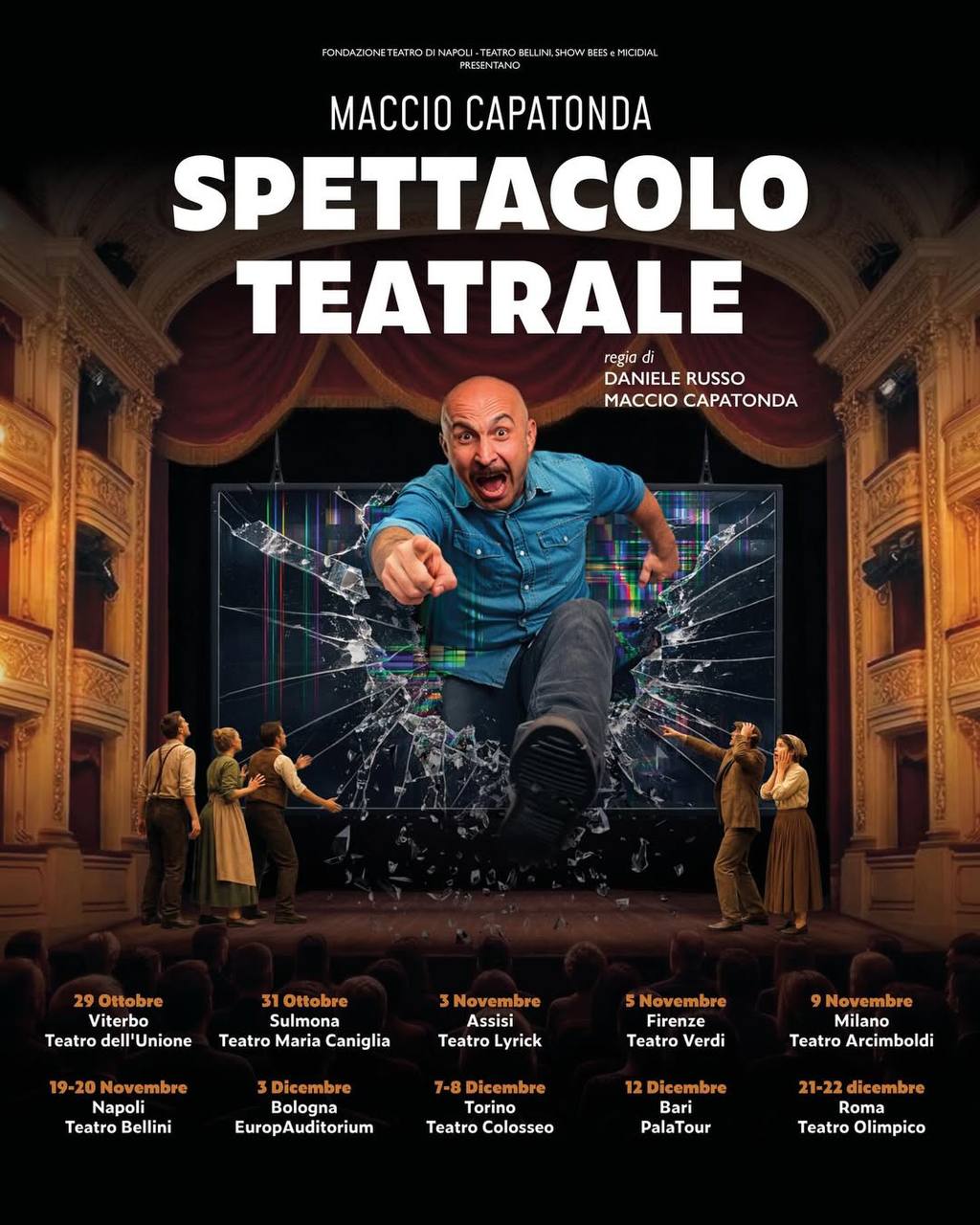 Lunedì 7 e martedì 8 dicembre 2026 Maccio Capatonda sarà al Teatro Colosseo di Torino con il suo "Spettacolo Teatrale". Due serate alle 20.30 per uno show che porta il suo linguaggio comico sul palcoscenico, dentro una struttura teatrale vera e propria.