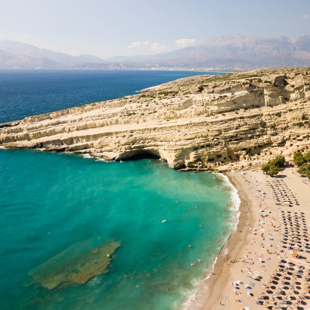 Spiaggia di Matala, Creta (Grecia): Posizionata sulla costa meridionale di Creta, è esposta ai caldi venti provenienti dall’Africa. La mitologia narra che fu qui che Zeus, trasformato in toro, giunse con la principessa Europa, prima di farla diventare madre di Minosse, il leggendario re di Creta.