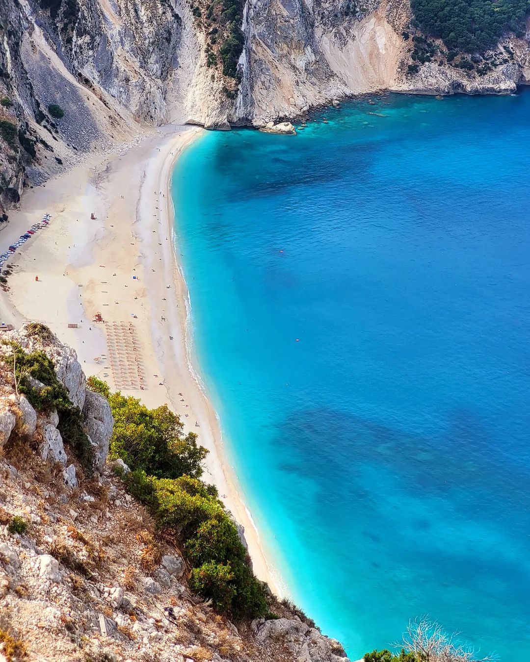 Spiaggia di Myrtos, Cefalonia (Grecia): Tra alte scogliere, questa spiaggia è stata location per il film “Il Mandolino del Capitano Corelli”. Offre una parte libera e una attrezzata.