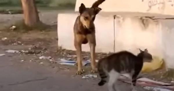È praticamente accerchiato, eppure riesce a farla franca. L'impavido gattino riesce ad allontanare i cani randagi e a guadagnarsi la fuga.