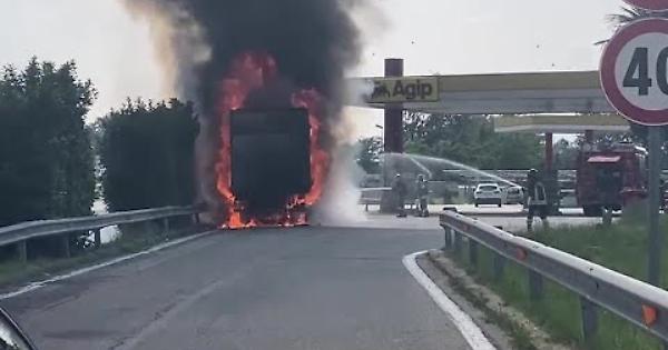 E' successo intorno alle 16.30, mentre il mezzo pesante era fermo nella stazione di servizio. Il camion, secondo quanto è stato ricostruito dalla polizia stradale intervenuta sul posto, trasportava medicinali e il rogo sarebbe stato accidentale: le fiamme sarebbero partite dal motore, probabilmente per un corto circuito, e si sono velocemente allargate alla cabina e al rimorchio.