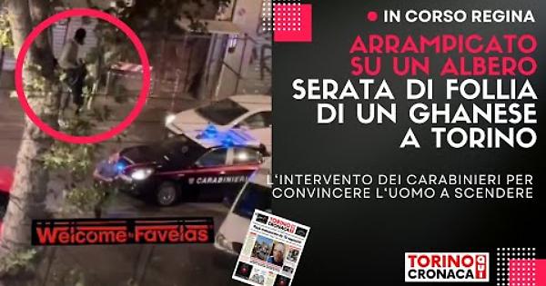Serata di follia, quella di ieri, per un ghanese 30enne che, dopo aver alzato un po' troppo il gomito, ha pensato bene di arrampicarsi su un albero di corso Regina Margherita e da lì cominciare a urlare le proprie "rivendicazioni". Sul posto, come morta un video diffuso dai canali social di "Welcome tu favelas", sono intervenuti i carabinieri, chiamati dai residenti che da balconi e finestre hanno assistito all'insolito spettacolo. E' così cominciata una "trattativa" tra i militari e l'uomo, nel tentativo di convincerlo a scendere dalla scomoda e pericolosa posizione.
