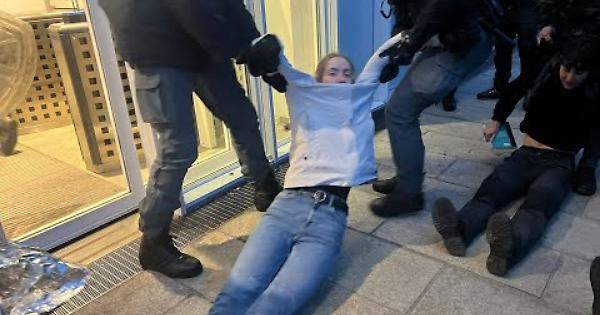 Stavolta erano moltissimi, almeno 150, al grattacielo Intesa SanPaolo di corso Inghilterra. Chi seduto a terra, incatenato all’entrata, chi invece suonava i tamburi. Altri, un’ottantina, hanno fatto irruzione nella hall, occupando l'ingresso. Sei ore dentro al “tempio” dell’alta finanza sono rimasti gli attivisti di Extinction Rebellion, senza alcuna intenzione di uscire. Un’azione, la terza della settimana, a 24 ore dal G7 sul Clima. All’ora di cena (erano le 20) è però scattato il blitz della polizia. Gli agenti sono entrati nel grattacielo e hanno portato via di peso ragazzi e ragazze. Il tutto in un corso Inghilterra completamente militarizzato da via Cavalli a corso Vittorio. Oltre alla polizia, anche i carabinieri e i vigili del fuoco, che poi sono intervenuti per far scendere gli attivisti che si erano arrampicati sui tiranti. Per i ragazzi e le ragazze che hanno fatto “occupazione” al grattacielo, scatterà con ogni probabilità la denuncia. Il pomeriggio, in corso Inghilterra, era iniziato senza particolari tensioni.