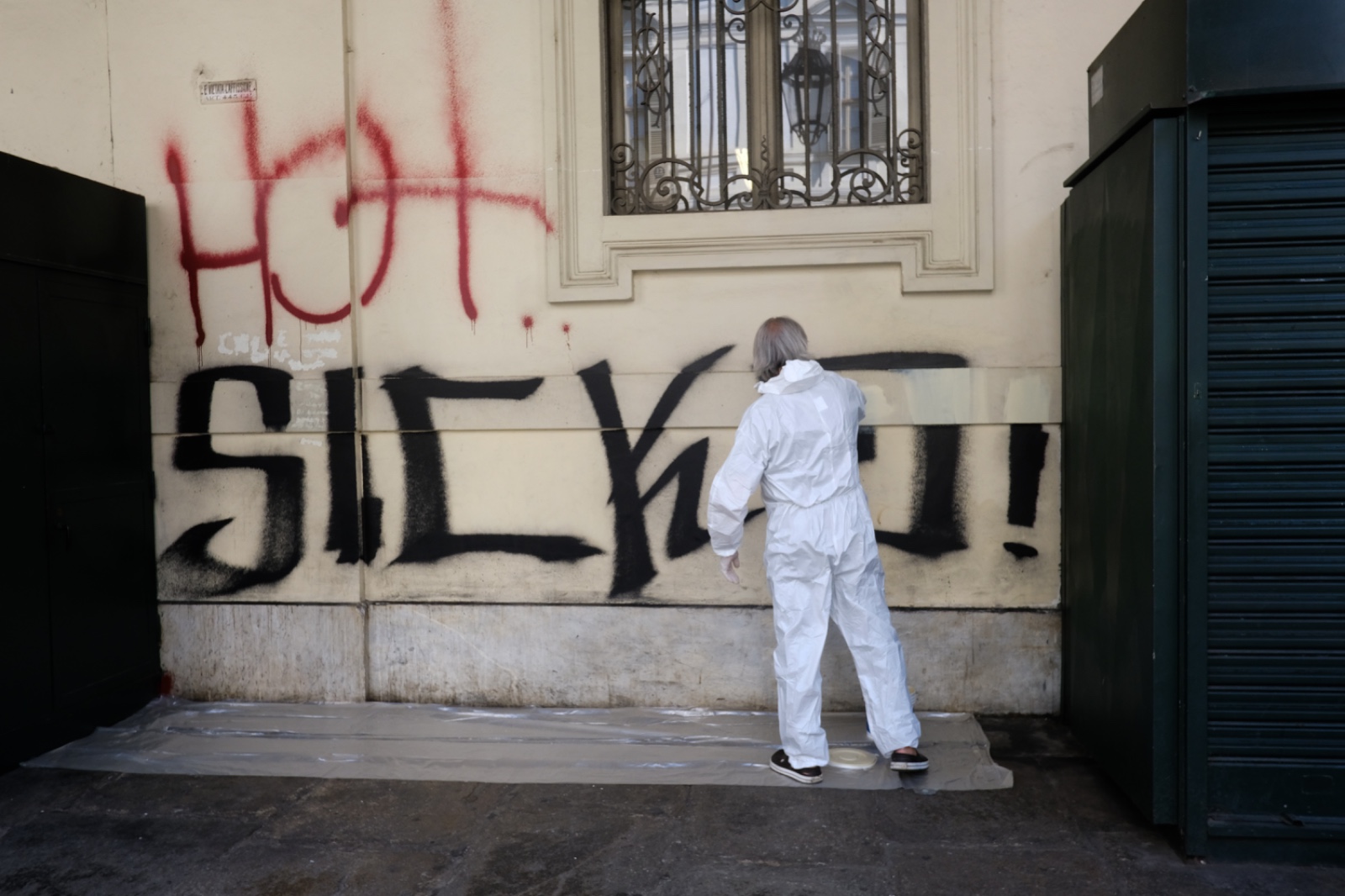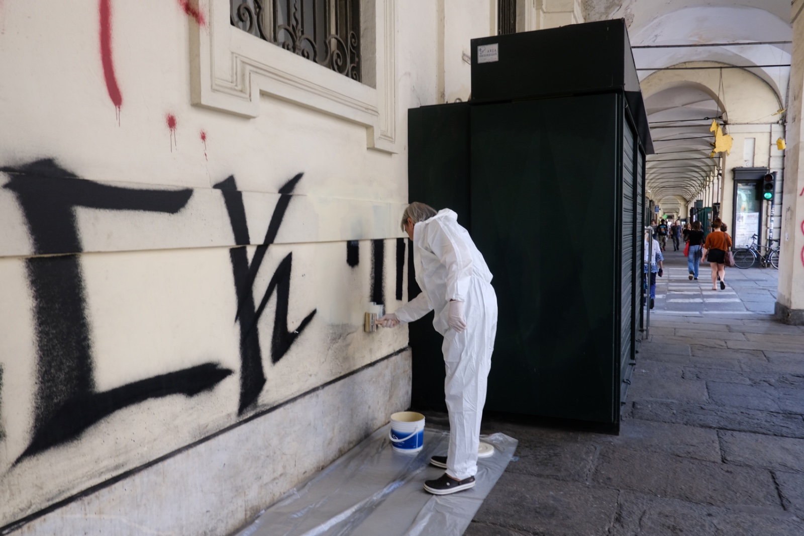 Dalle nove e mezzo del mattino in tantissimi si sono affaccendati a ripristinare i muri di quel porticato troppo spesso preso di mira da vandali, manifestanti e graffitari improvvisati. Ci sono residenti, commercianti, addirittura turisti che a Torino si trovano per qualche giorno di vacanza. Come Beatrice, la grafologa giudiziaria romana che si è innamorata di via Po un anno fa ed oggi ha scelto di essere qui, parte di un’iniziativa che è la prima nel suo genere. Pennello alla mano anche per Andrea, figlio di un libraio di via Po, che col sorriso cancella brutte parole impresse sul muro con una bomboletta nera.