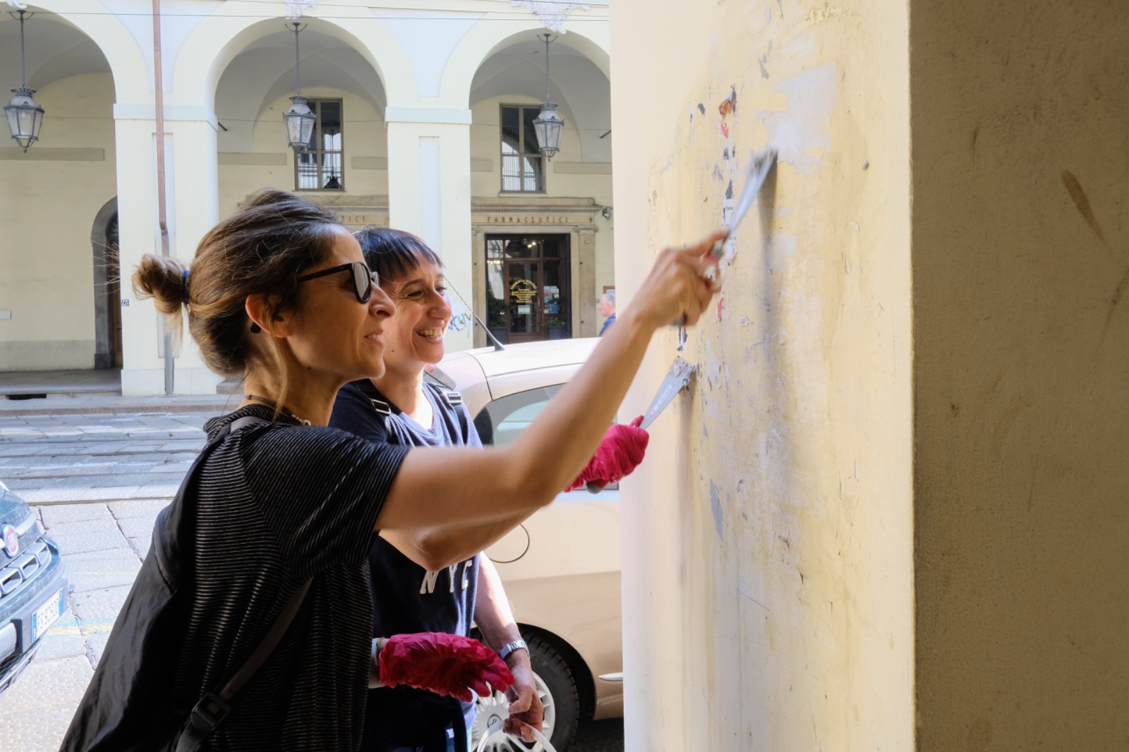 Un gruppo di ragazze orientali sta cancellando osceni disegnini all’angolo con piazza Castello. Un’atmosfera serena e giocosa. “Però se li ribecco a scrivere sui muri gli toccherà passare da me per prendere un antidolorifico” scherza la farmacista Carla.