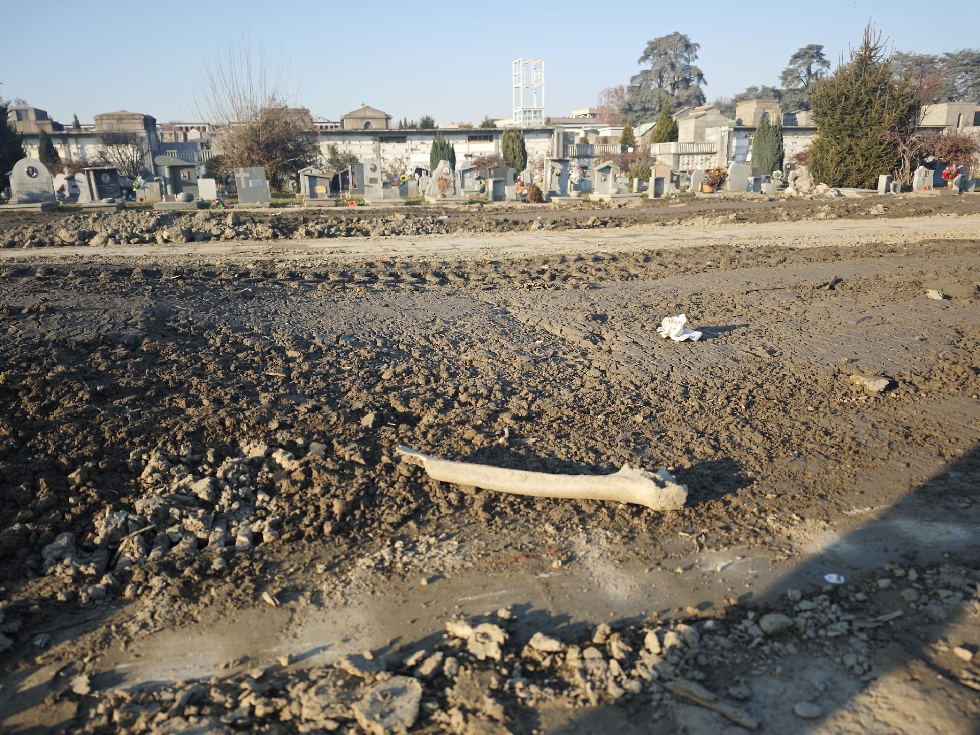 Vertebre e ossa del braccio e della gamba in mezzo al terreno smosso. E, qualche metro più in là, rosari, indumenti, fiori e foto dei defunti, seppelliti anche di recente: tutto abbandonato in un campo appena dragato al cimitero Monumentale di Torino. «Capiamo che ci sia bisogno di spazi per nuove sepolture ma questa è una mancanza di rispetto nei confronti dei morti - si sfogano Daniele Lionello e Nicoletta Branco, i primi a notare questi resti al Campo E del Settimo Ampliamento - Il risultato è una discarica di ossa a cielo aperto».