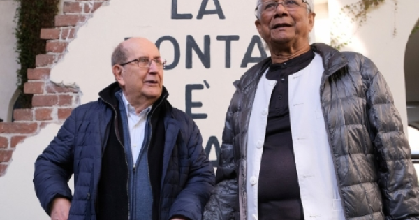 Passeggiano tra le mura le Sermig mano nella mano, il fondatore dell’Arsenale per la Pace Ernesto Olivero e il premio Nobel per la Pace Muhammad Yunus. E in quel gesto c’è già tutta la forza e la delicatezza che i due uomini sanno trasmettere. Alla vigilia dell’inizio del lavori del Global Social Business Summit - che quest’anno si tiene a Torino, presso La Centrale della Nuvola Lavazza - Olivero e Yunus si intrattengono in conversazioni sulla crisi che il mondo moderno sta attraversando e su cosa fare per cercare di invertire la tendenza. «Prima di tutto dobbiamo prendere atto che quella che stiamo vivendo è una crisi della civilizzazione e» spiega l’economista, ideatore del micro credito moderno. «Quello che Ernesto fa in questo luogo è il frutto di una persona che pensa in modo differente - prosegue -. Solo così si possono fare grandi cambiamenti nel mondo». Il fondatore del Sermig, dal canto suo, mostra a Yunus i progetti di sviluppo realizzati dal gruppo Rete (Restituzione tecnologica): dall’idro pedale che purifica l’acqua al frigorifero alimentato a energia solare. Il tour prosegue nell’ufficio di Olivero. Sulla porta c’è un cartello che recita “Entrare senza bussare”. Yunus ride e varca la soglia.