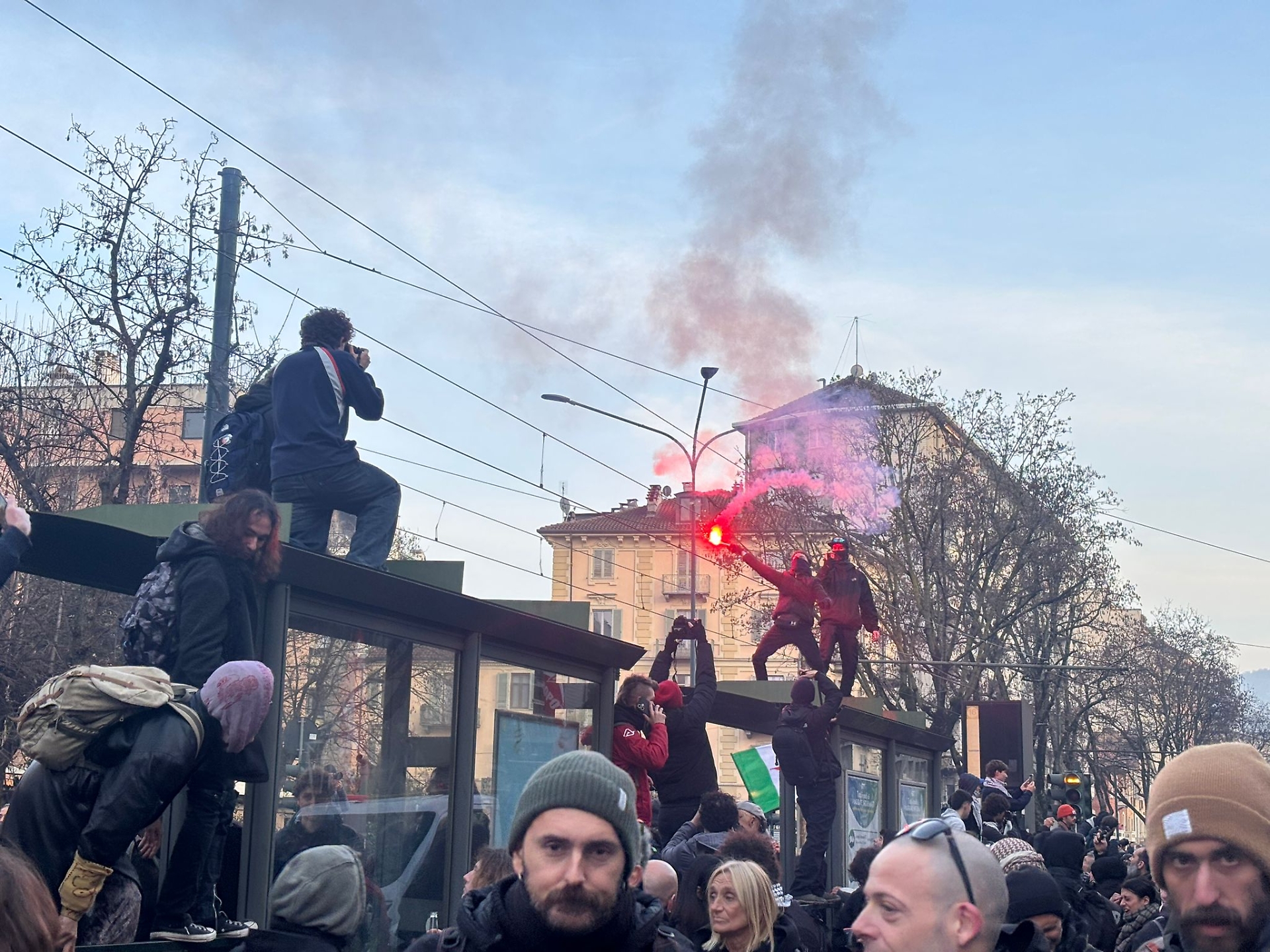 Intanto sale la tensione, con alcuni manifestanti che hanno acceso fumogeni colorati di rosso. Alcuni sono saliti sopra le pensiline delle fermate del tram. Molti si sono coperti il volto e si sono staccati dal corteo principale per tentare di avvicinarsi ad Askatasuna.