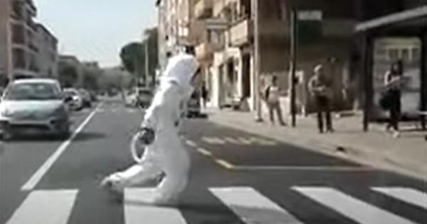 orse ha fatto tardi e ha perso la coincidenza per la stazione spaziale: fatto sta che sulle strisce pedonali sta passando un astronauta.