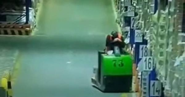 Mai distrarsi alla guida di un carrellino dentro un magazzino, si potrebbe causare un patatrac come quello deteminato da questo pasticcione.