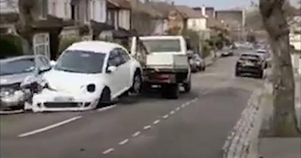Che scena: l'autista del furgoncino chiamato a rimuovere un'auto incidentata riesce a centrare tutte le altre vetture in sosta nel vialetto.
