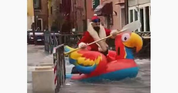 C'è l'acqua alta, ma che ci fa un tale vestito da Babbo Natale su un grosso salvagente utilizzato come barchetta? Chissà: il mondo è strano.