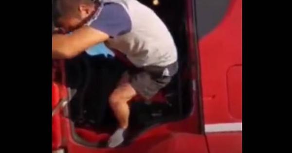Non ci sarebbe neppure bisogno di fargli l'alcol test, il camionista è completamente ubriaco: e per poco non rovina giù dal suo automezzo.