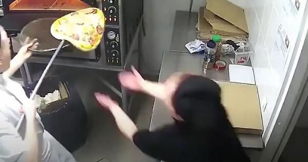 Che spreco in pizzeria. Nel trasferire la pizza dal forno al cartone, la lasciano cadere sul pavimento. E, non contenti, se la ridono pure.