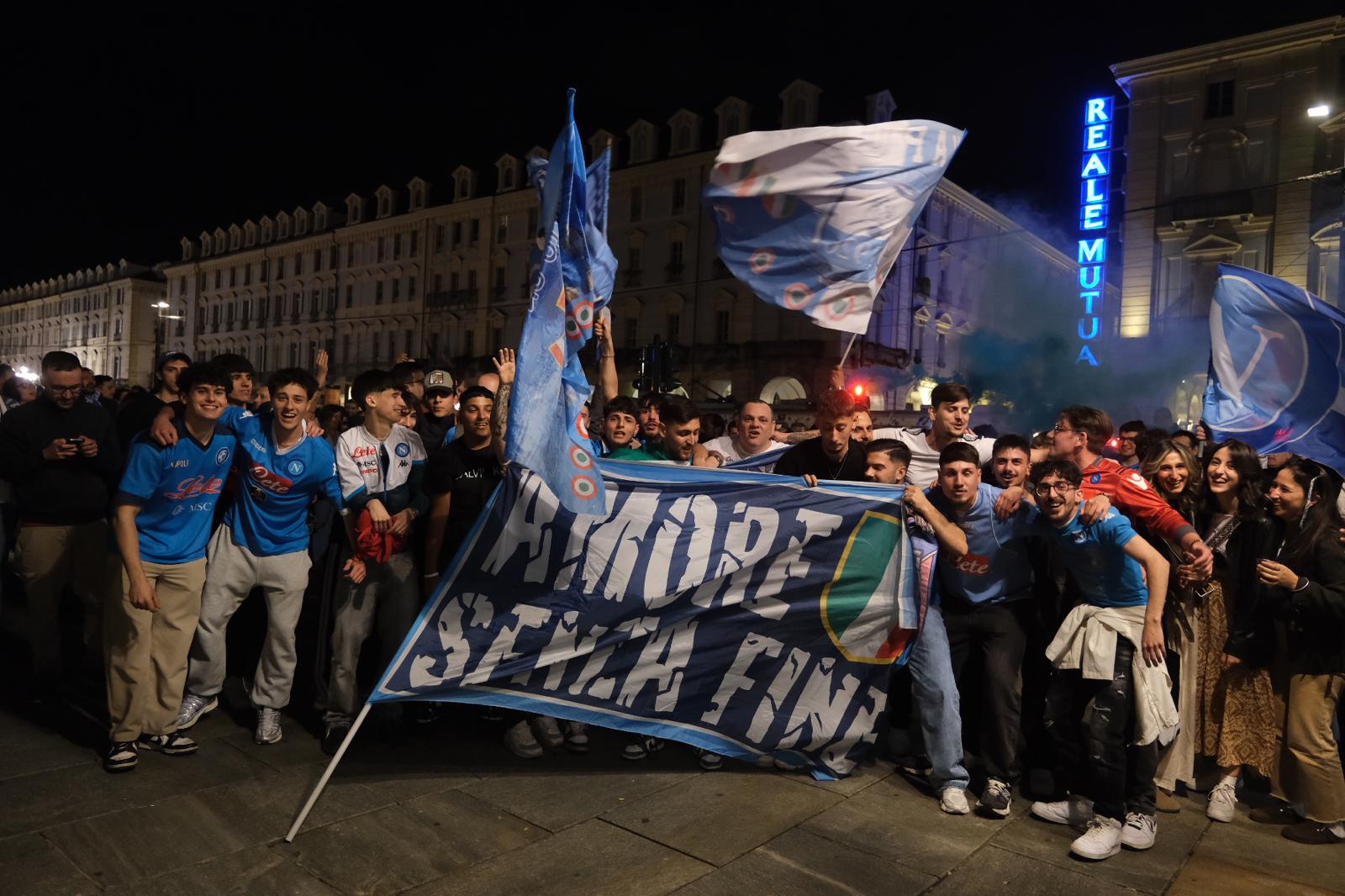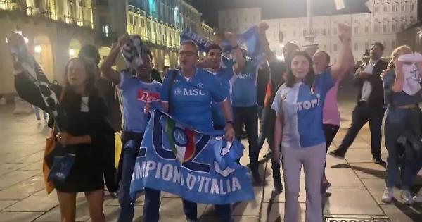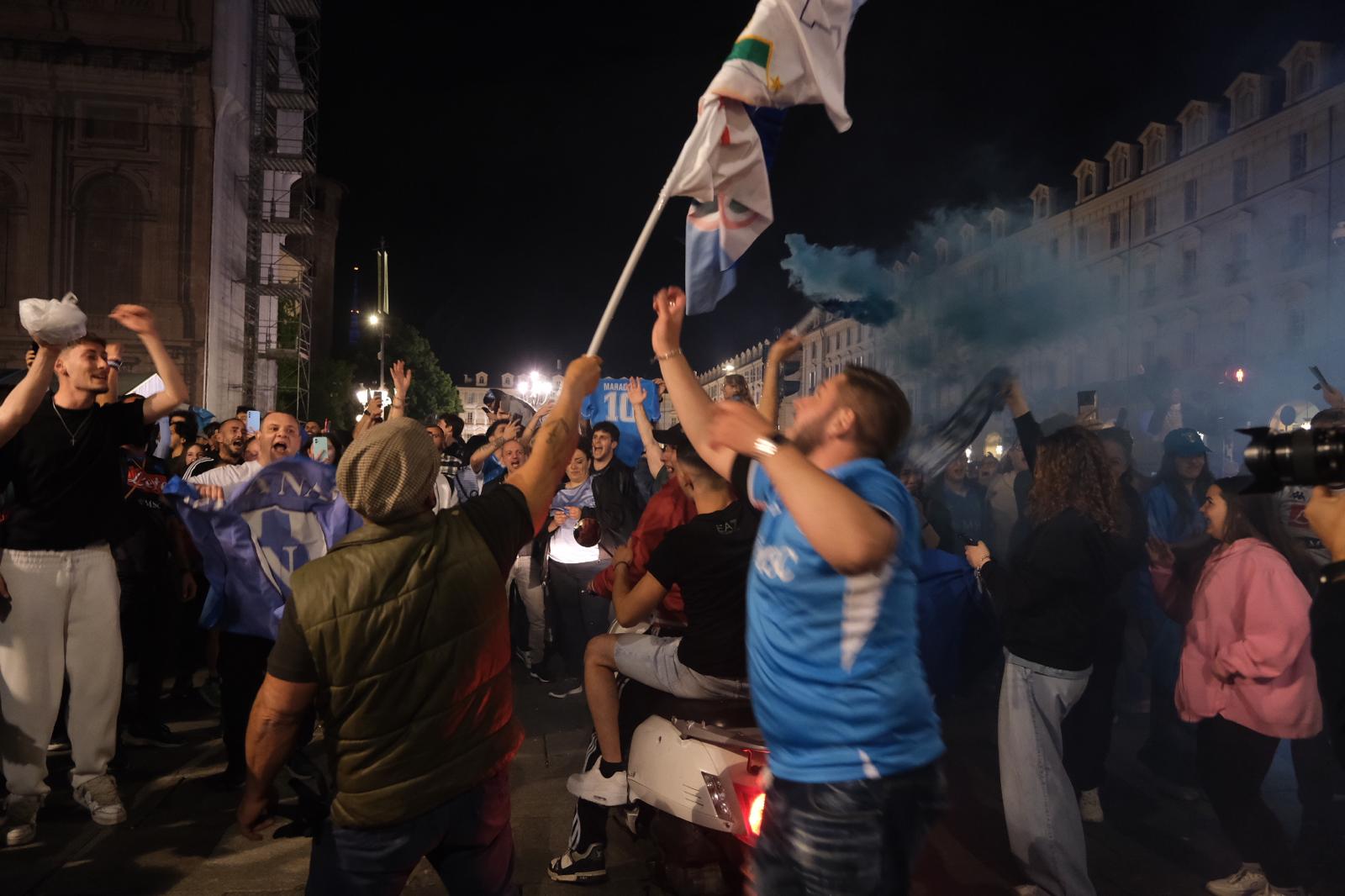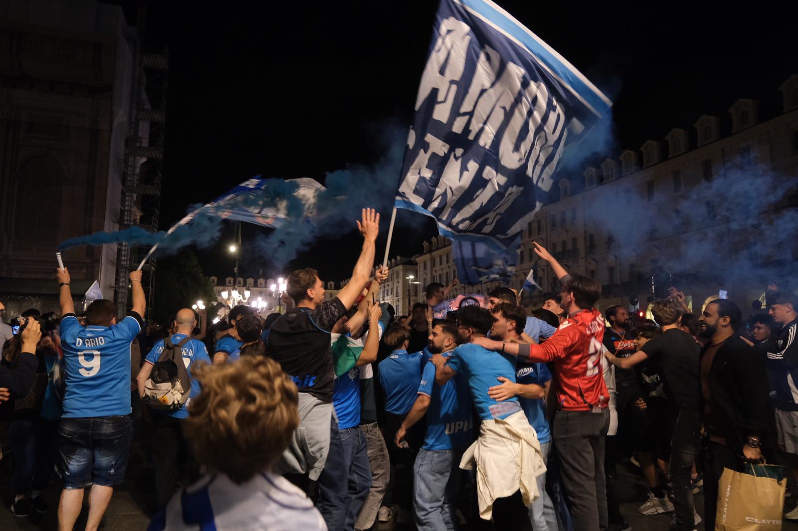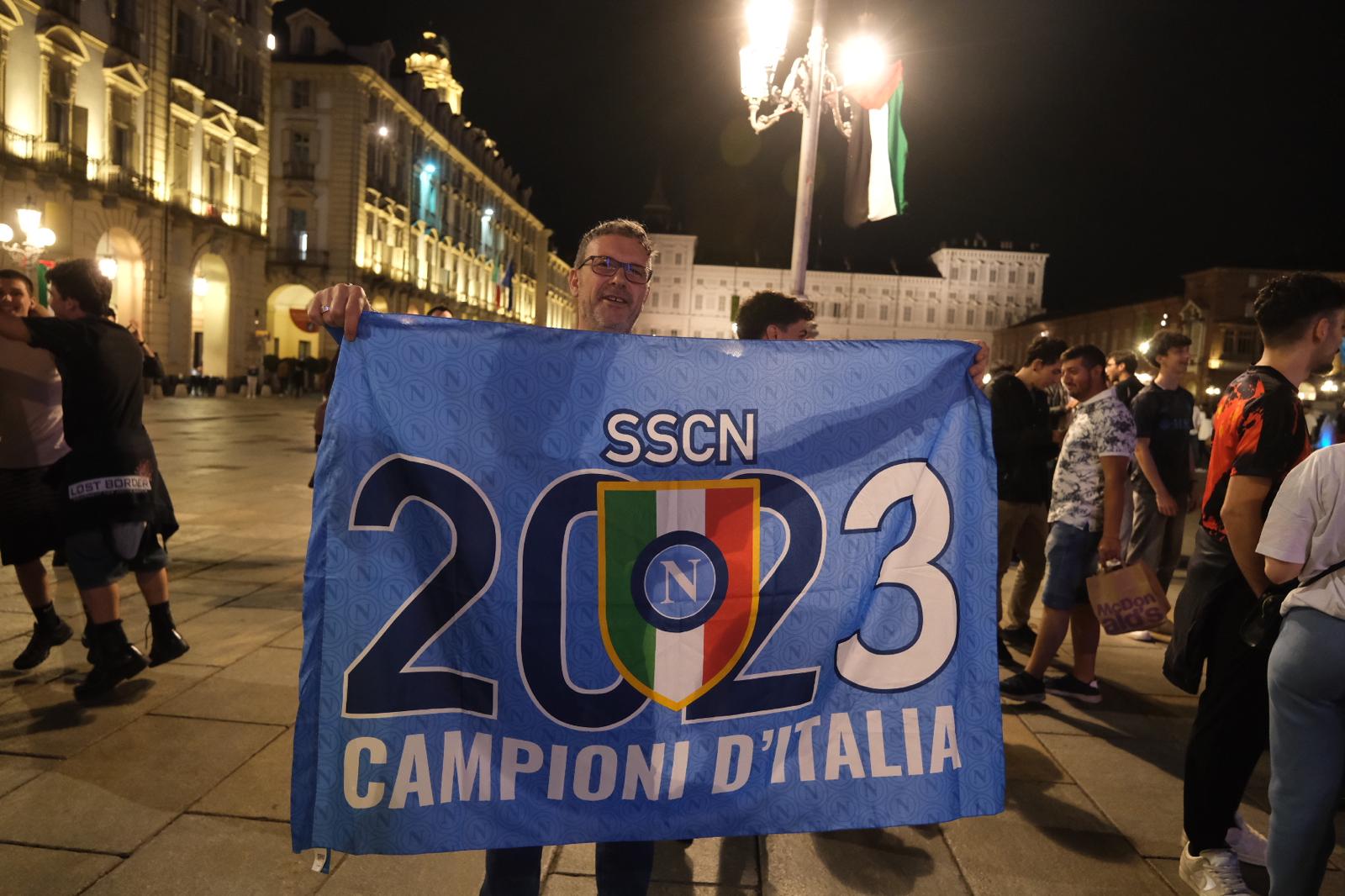 Come due anni fa, ancora una volta, piazza Castello si colora di azzurro per il Napoli campione d'Italia. Allora c'era Spalletti, ora c'è Antonio Conte alla guida degli azzurri. Bandiere azzurre con il tricolore in mezzo e cori, tanti cori per la squadra campione d'Italia. Poi ancora fumogeni e qualche clacson. Una vera e propria impresa che è stata festeggiata anche in piazza, sotto la Mole. Circa trecento tifosi azzurri si sono radunati per fare festa, un cuore solo con Napoli, ad oltre 800 chilometri di distanza. Per la società di Aurelio De Laurentiis si tratta del secondo scudetto vinto negli ultimi tre anni, il quarto in assoluto nella storia del club campano.