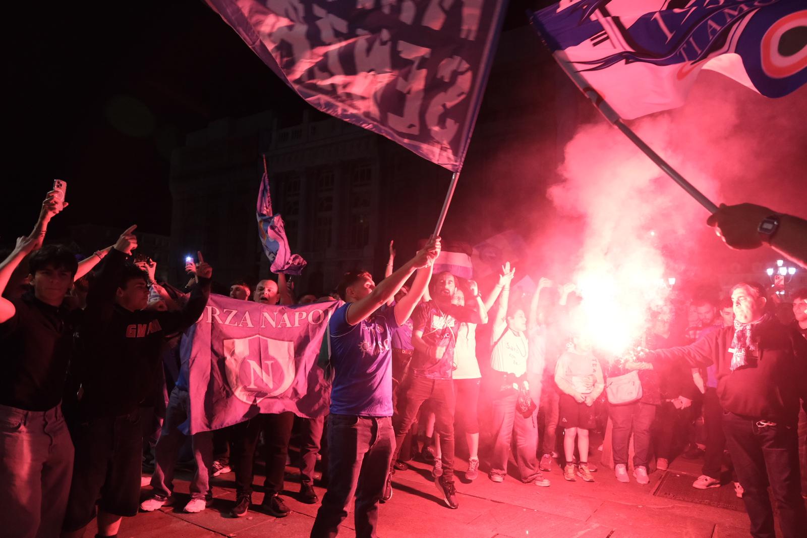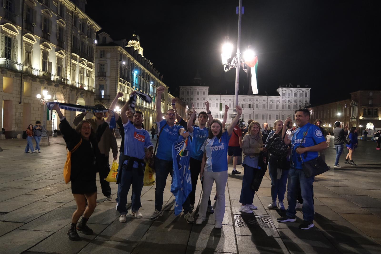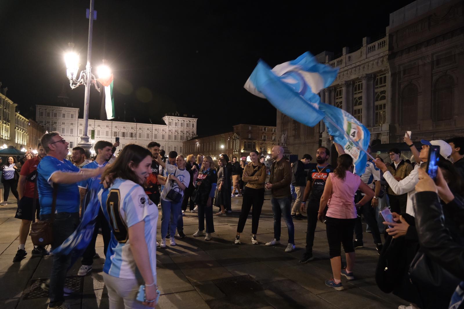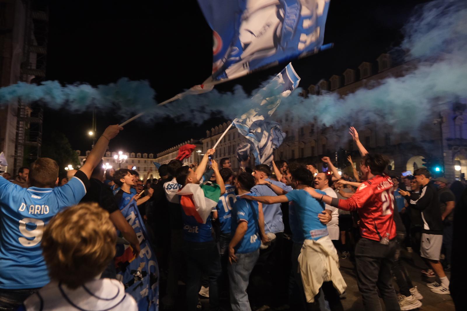 Come due anni fa, ancora una volta, piazza Castello si colora di azzurro per il Napoli campione d'Italia. Allora c'era Spalletti, ora c'è Antonio Conte alla guida degli azzurri. Bandiere azzurre con il tricolore in mezzo e cori, tanti cori per la squadra campione d'Italia. Poi ancora fumogeni e qualche clacson. Una vera e propria impresa che è stata festeggiata anche in piazza, sotto la Mole. Circa trecento tifosi azzurri si sono radunati per fare festa, un cuore solo con Napoli, ad oltre 800 chilometri di distanza. Per la società di Aurelio De Laurentiis si tratta del secondo scudetto vinto negli ultimi tre anni, il quarto in assoluto nella storia del club campano.