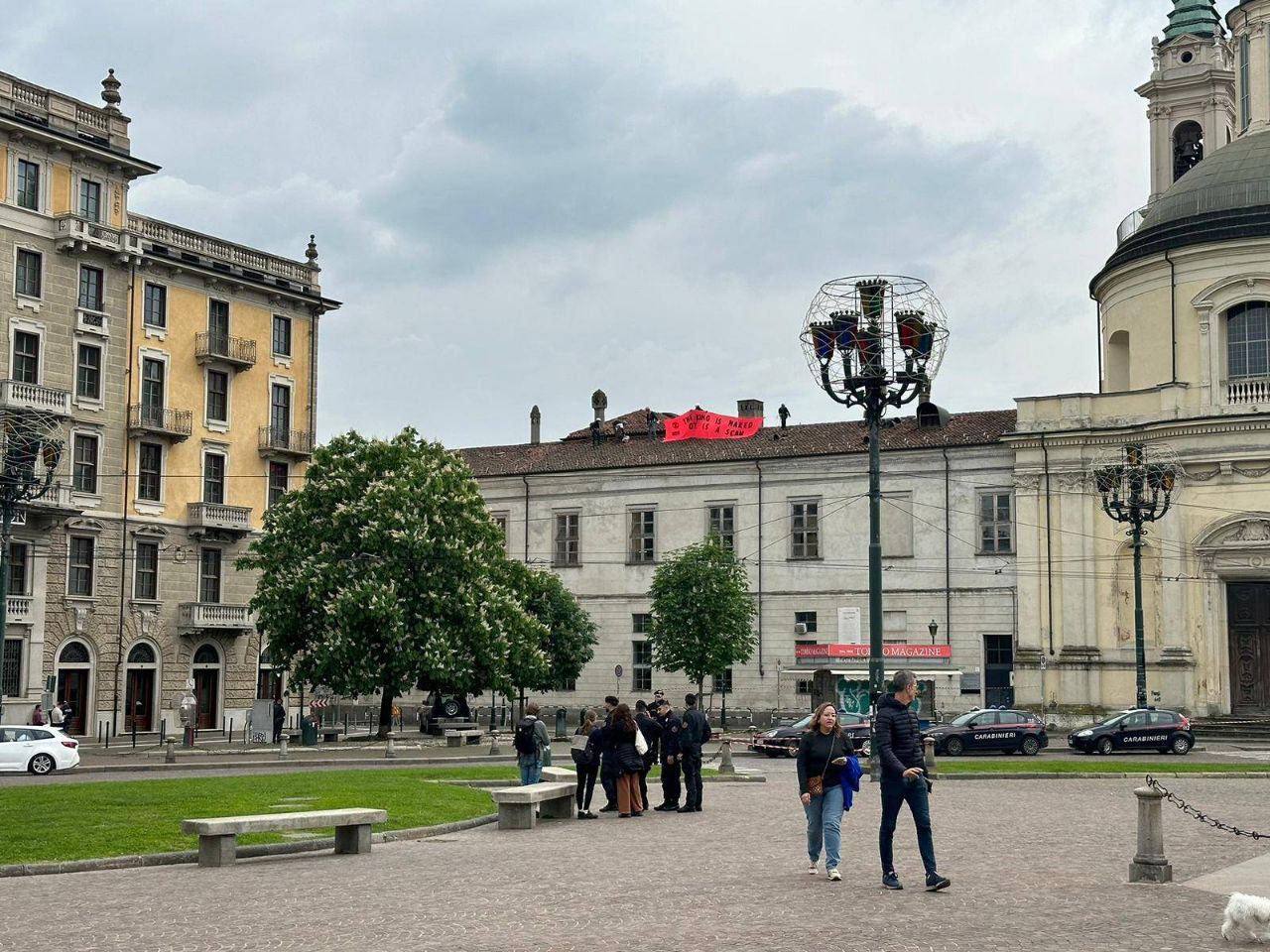 Il palazzo si affaccia direttamente su piazza Carlina, chiusa per ospitare i ministri presso l'NH Hotel. Nel frattempo, altri attivisti radunati nella piazza sono stati fermati e allontanati (come si vede nel video qui sopra).