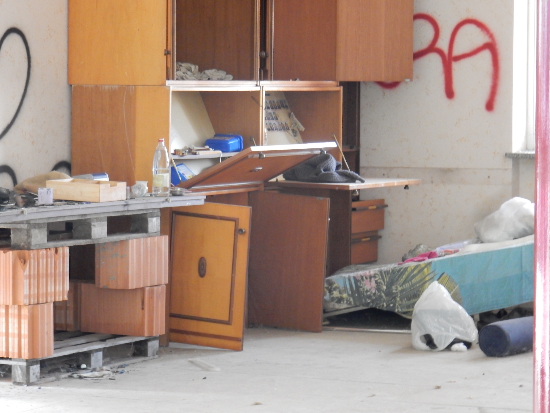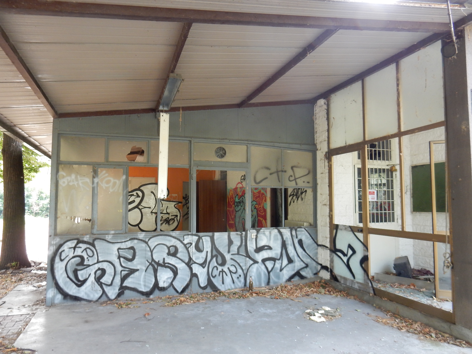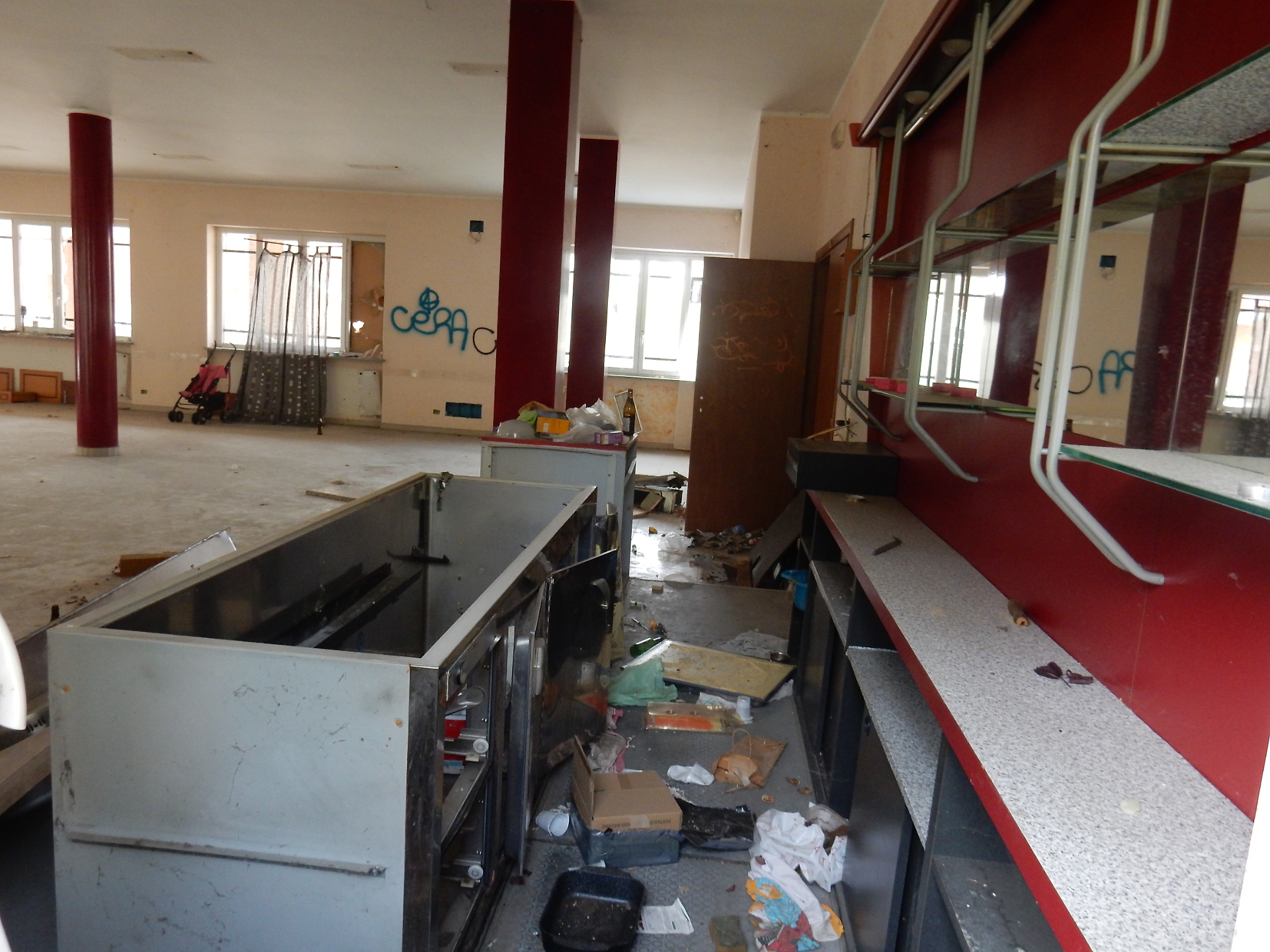 Una parte è stata totalmente blindata dalle occupazioni abusive. Dentro si riesce ancora ad entrare scavalcando (con un po’ di fatica), ma chi accede furtivamente non può andare oltre le prime due stanze. Dove i controsoffitti sono stati smontati e dove si cammina su un tappeto di cocci vetro e di polvere. Tra scritte sui muri e cattivi odori, che da queste parti la fanno da padroni. Sigillate, invece, le porte che conducono a quello che una volta era un salone polivalente.