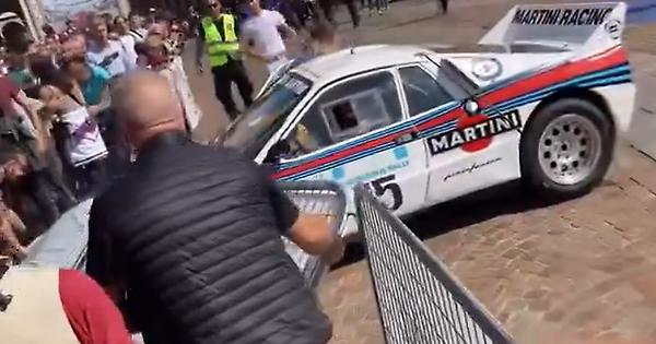 Il rombo dei motori, i bolidi che sfilano - per fortuna a velocità moderata - e quella Lancia 037 che accelera e sbanda sul pavè della piazza: il retrotreno se ne va e tradisce il pilota, mentre la vettura finisce contro le transenne dietro le quali ci sono gli spettatori assiepati.