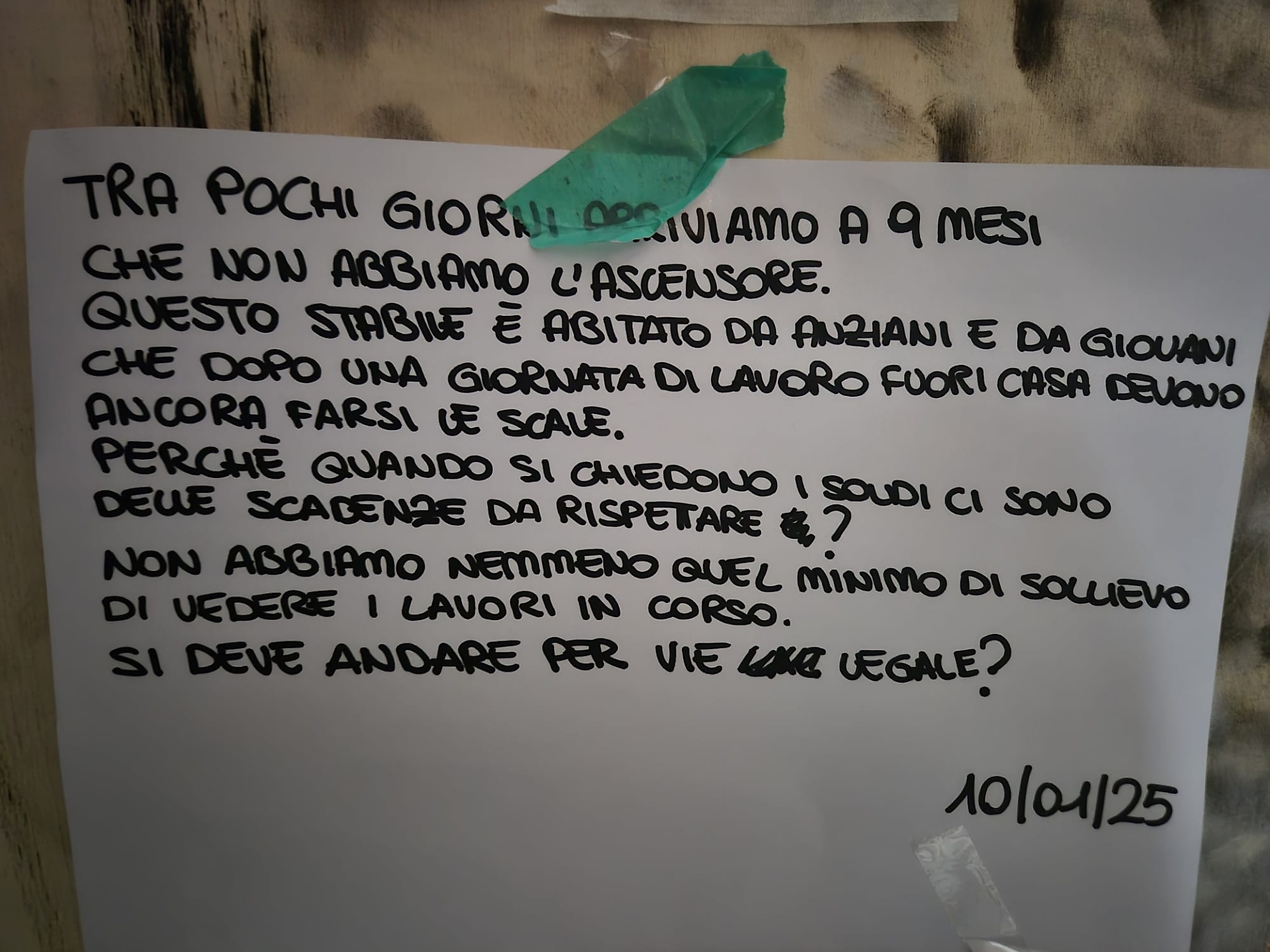 Le proteste non mancano, soprattutto in forma scritta. Carlo Gregorio, arzillo 93enne residente all’ultimo piano, l’ha presa con ironia, affiggendo un biglietto all’ingresso. “Ho 93 anni, chissà se vedrò ancora l’ascensore funzionare. E’ dal 16 aprile 2024 che non c’è più e io sono prigioniero in casa. Hanno impiegato dieci mesi per ricostruire il ponte di Genova, e per sostituire un ascensore?”. Ma c’è anche un secondo biglietto, non firmato e datato 10 gennaio, dunque pochi giorni fa. “Tra pochi giorni saranno nove mesi senza ascensore. Questo stabile è abitato da anziani e da giovani. Non abbiamo nemmeno quel minimo di sollievo di vedere i lavori in corso”.