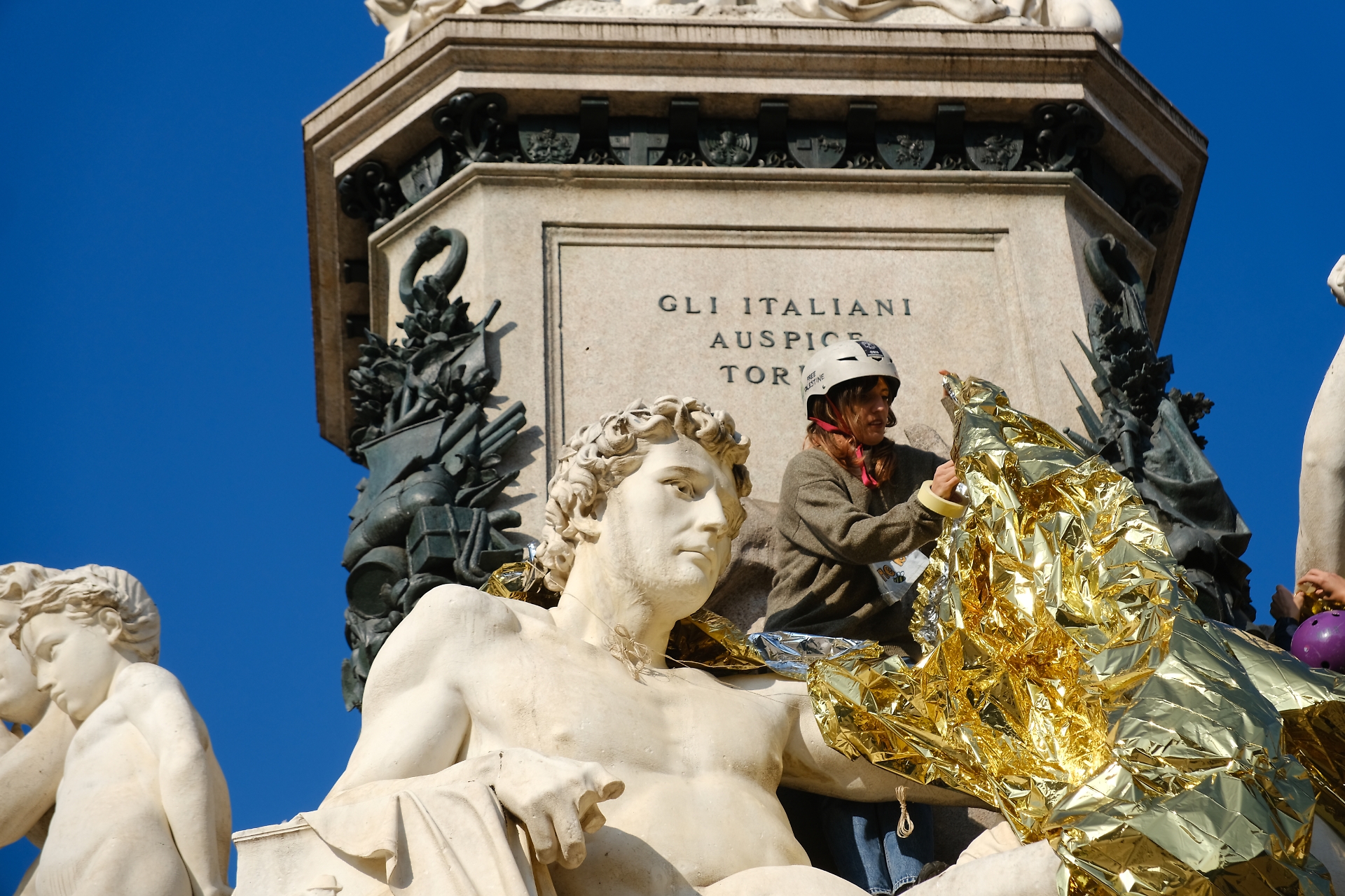 La scelta della piazza non sarebbe infatti casuale: vicino al monumento si trovano strutture come l’hotel Collection NH e la banca Mediobanca, simboli di lusso che, secondo gli attivisti, contrastano con le conseguenze della crisi climatica.